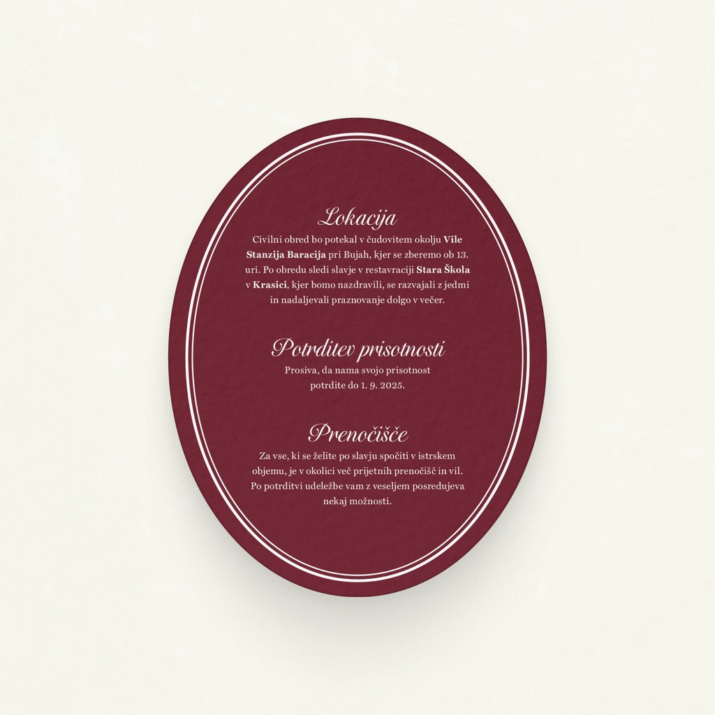 Ja. Pred končno potrditvijo po pošti prejmeš vzorec oblikovanega vabila, da občutiš papir, barve in kakovost tiska v živo.