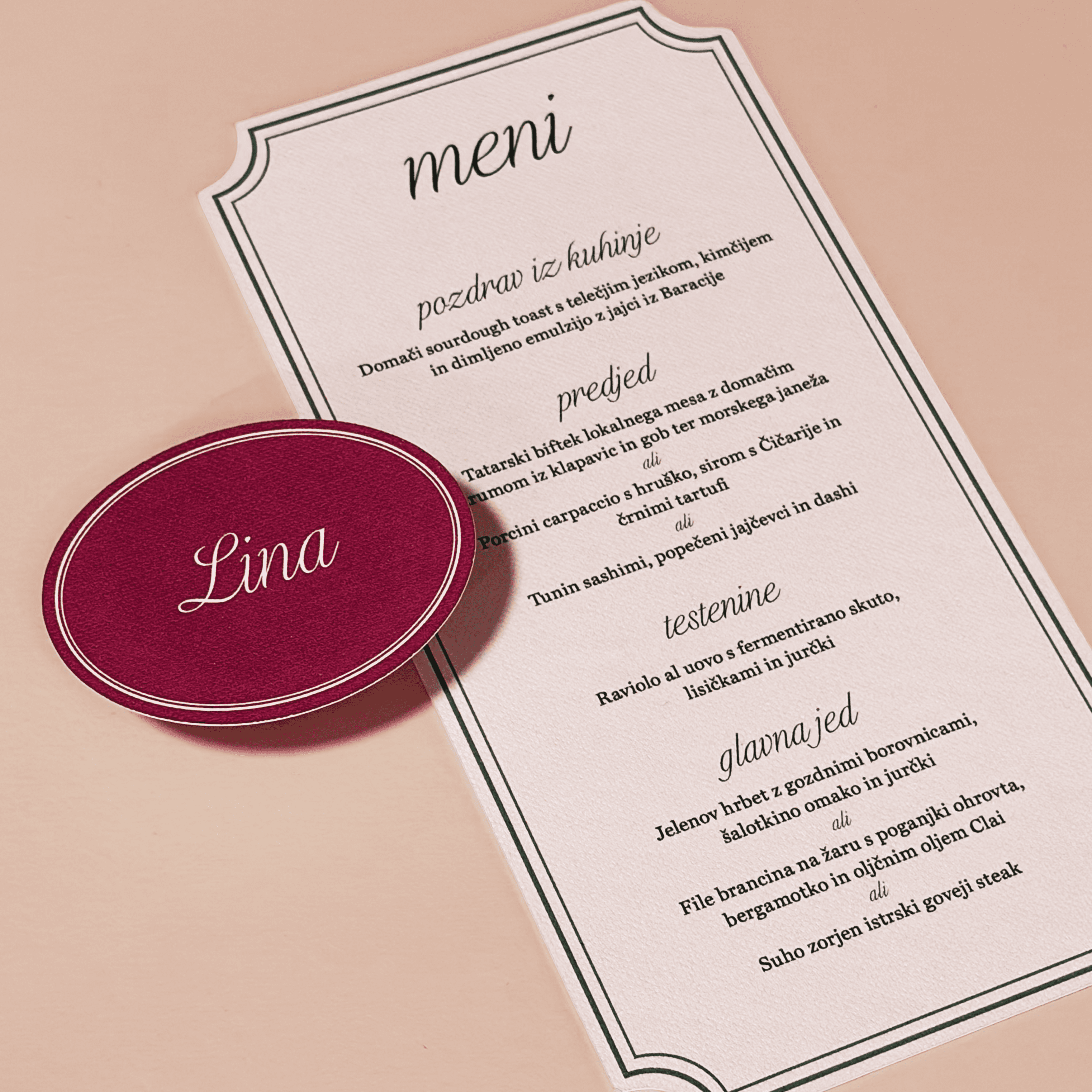 Elegantna linija z izrazito klasičnim karakterjem. Prečiščene oblike, ornamentalni robovi in poudarjena tipografija za brezčasno razkošje.